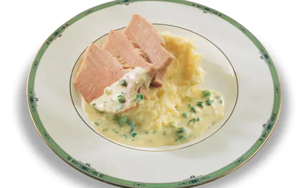 Stir in the cream and scallions and taste for seasoning. Serve the corned beef sliced with the parsnip mash, sauce and buttery cabbage.