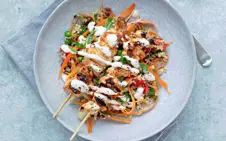 To prepare the chicken: In a bowl mix together olive oil, lemon juice, thyme leaves, mint leaves and garlic.