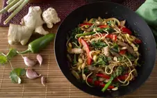 To cook the vegetables: Heat a little oil in a large, non-stick frying pan or wok, add the ginger, chilli and garlic.  Stir then add in the onion and peppers. Stir-fry for 4-5 minutes until the onion and peppers have softened. You may need to do this in two batches depending on the size of your pan. Remove to a plate and keep warm while you cook the lamb.
