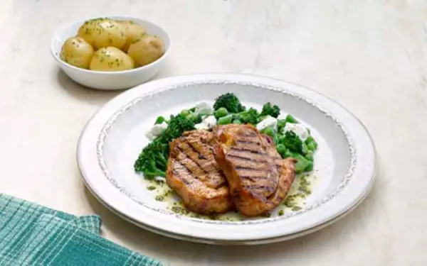 Serve the chops with a little of the reserved dressing spooned over them along with the salad and steamed potatoes.